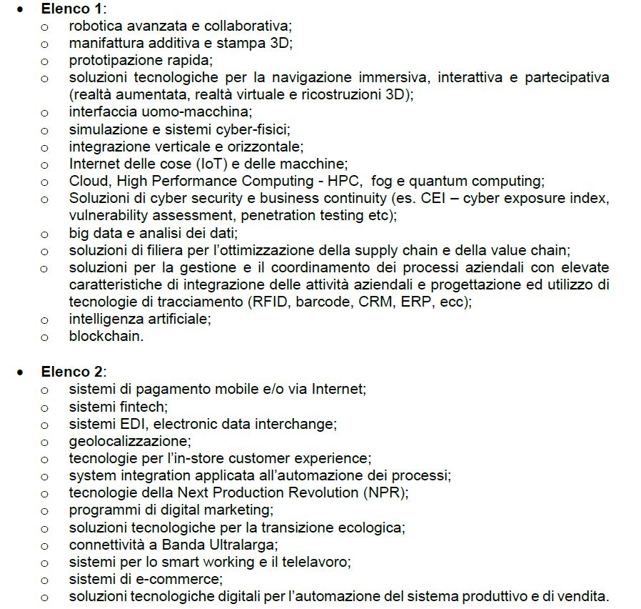 I progetti devono riguardare almeno una delle tecnologie di innovazione digitale 4.0 riportate nell’Elenco 1 – inclusa la pianificazione o progettazione dei relativi interventi – ed eventualmente una o più tecnologie dell’Elenco 2, purché propedeutiche o complementari a quelle previste all’Elenco 1.
