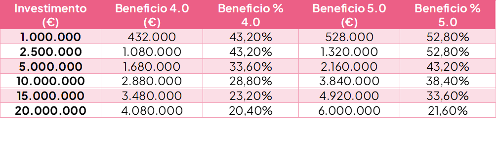 - +220% fino a €2,5 milioni (agevolazione fiscale pari al 52,8%)