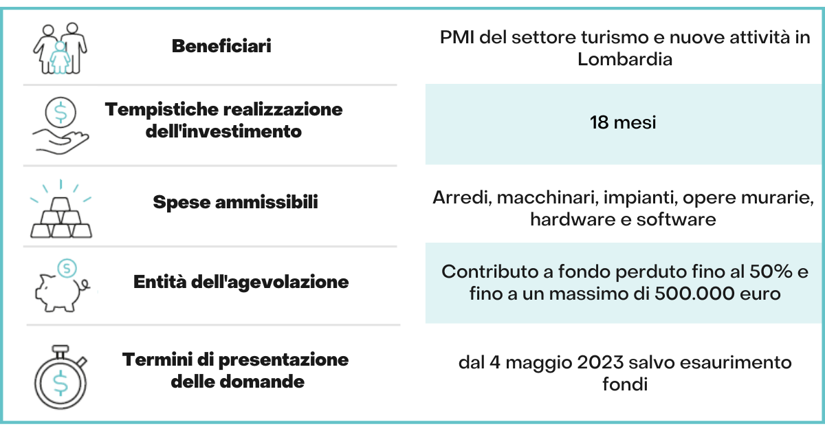 - in caso di realizzazione di nuova struttura: dichiarino l’intenzione di esercitare una delle tipologie di attività ricettiva di cui sopra, e dichiarino l’intenzione di attivare, entro e non oltre la richiesta di erogazione del saldo, una sede operativa in Lombardia.