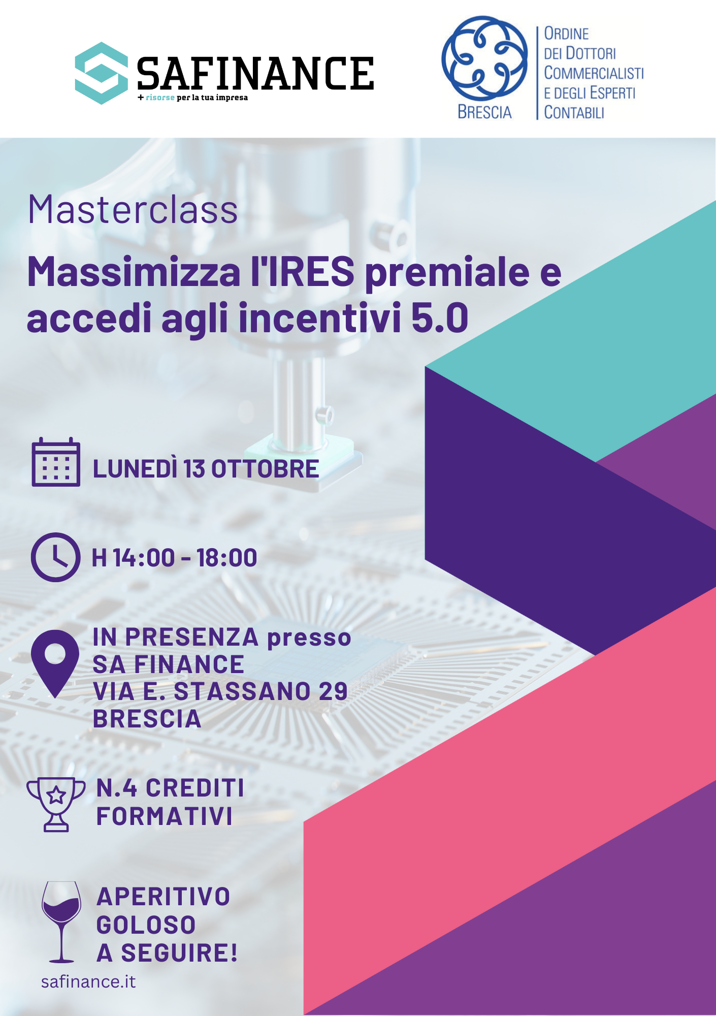Prenota ora il tuo posto alla nostra masterclass dedicata a IRES Premiale e Credito d’Imposta 5.0: due agevolazioni per che in questo momento rendono la tua consulenza alle imprese ancora più strategica!