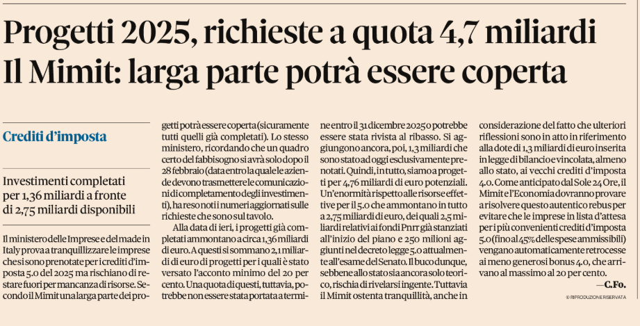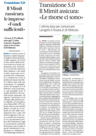 A questi si aggiungono gli 1,3 miliardi previsti dalla legge di bilancio attualmente destinati a Transizione 4.0: quindi le domande non coperte da Transizione 5.0 utilizzerebbero il programma 4.0.